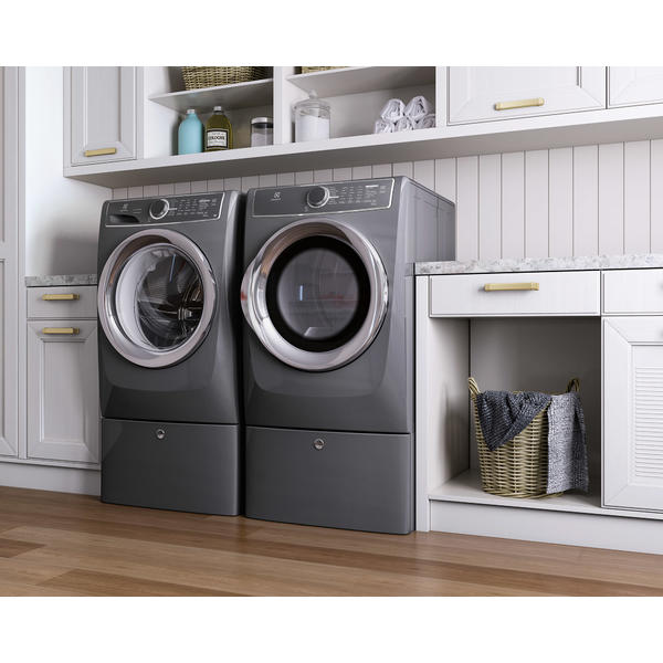 The electrolux laundry pedestal with storage drawer helps you organize the entire laundry room.